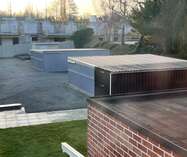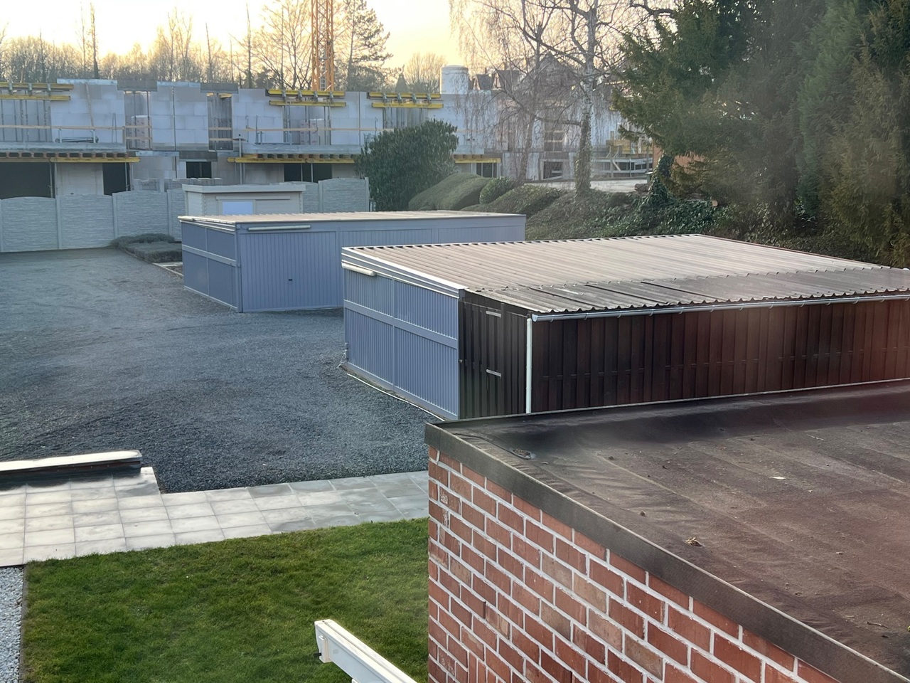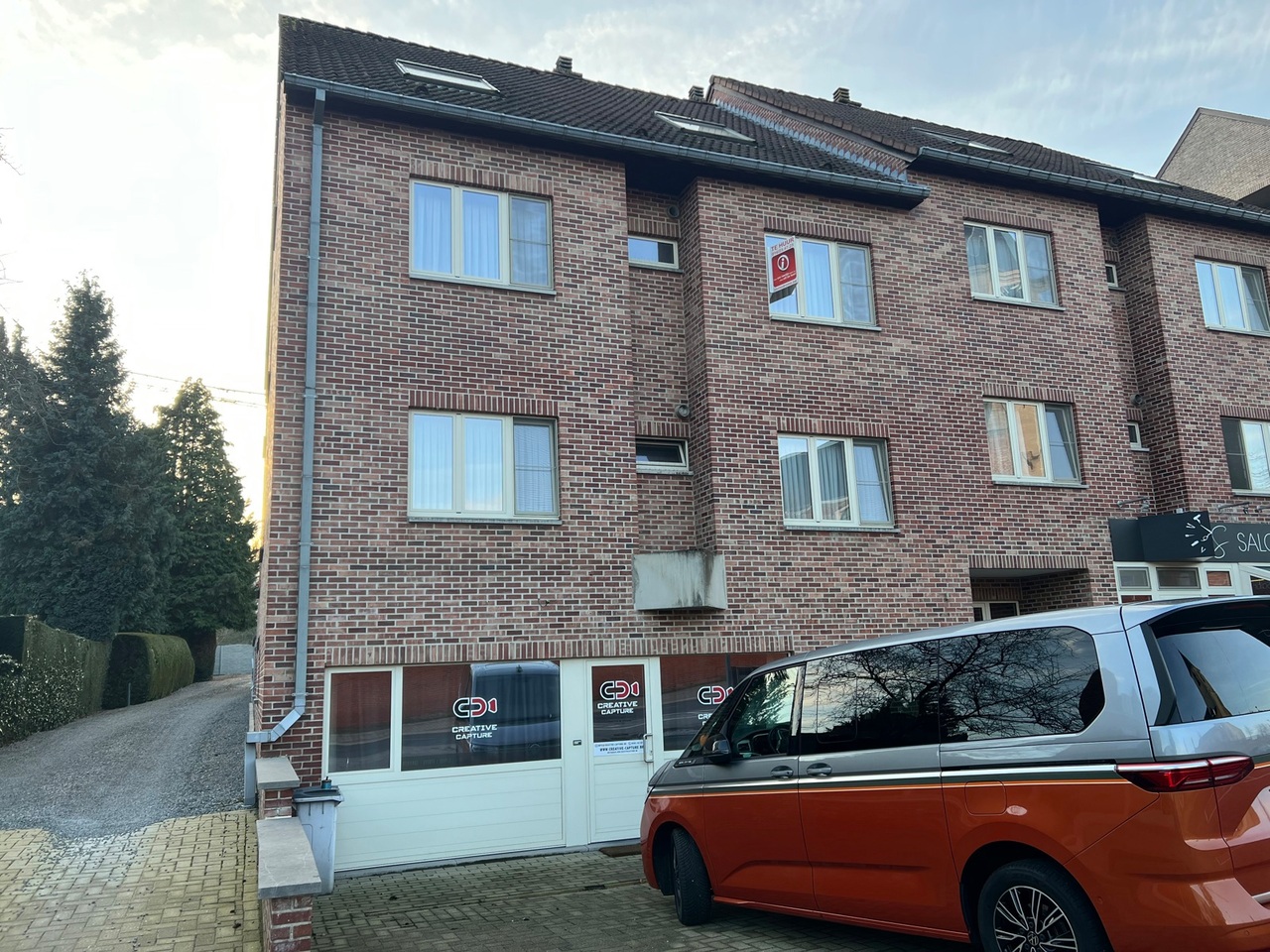 Parkeerbox achteraan het gebouw, te bereiken via een oprit naast het gebouw.