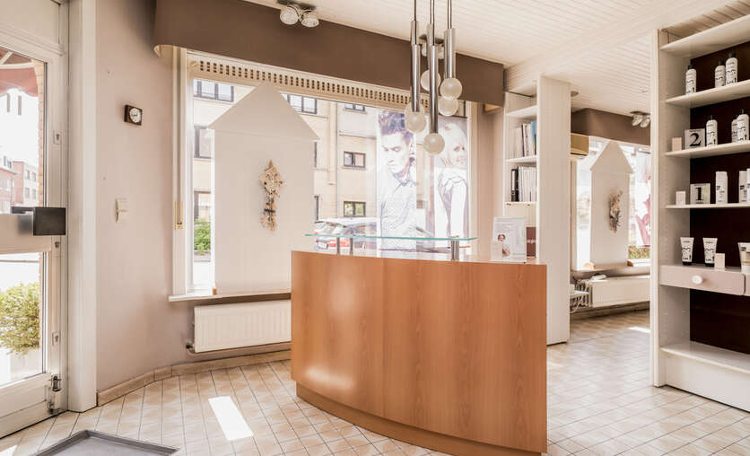 gelijkvloers: kapsalon met apart toilet, keuken, technische ruimte, toegang tot de kelder en garage.